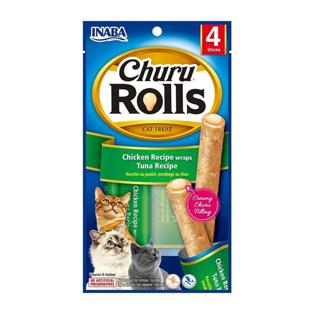 تشویقی «چورو رولز» (Churu Rolls) با طعم ترکیبی «مرغ و ماهی تن»، میانوعدهای لذیذ با ساختار مدادی (Stick) است. این محصول دارای بافتی دوگانه است: لایه بیرونی از مرغ پخته شده و نرم تشکیل شده و مرکز آن با کرم محبوب چورو با طعم ماهی تن پر شده است. بستهبندی حاوی ۴ عدد رول ۱۰ گرمی است که فاقد غلات و مواد نگهدارنده بوده و با ویتامین E غنی شدهاند.
