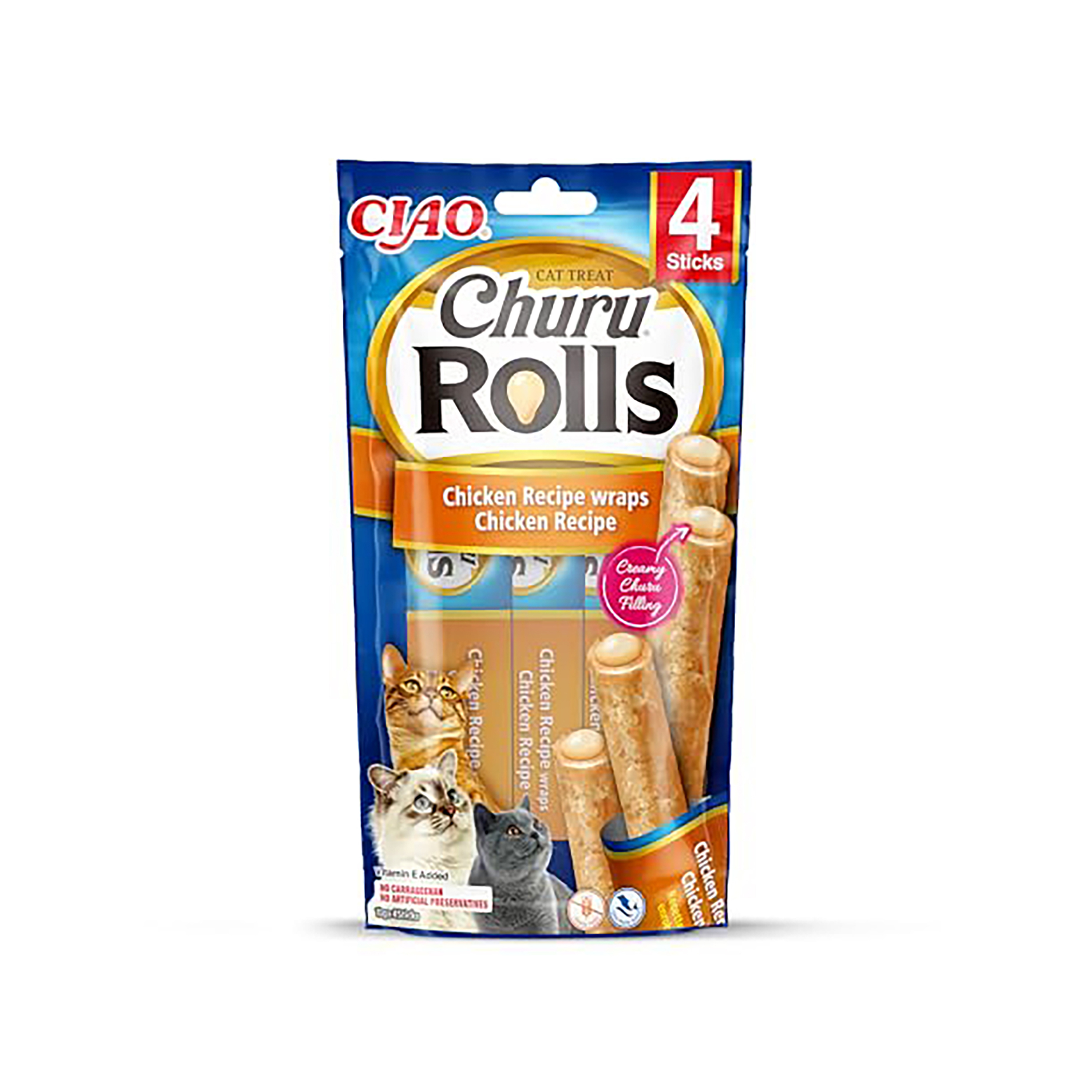 تشویقی «چورو رولز» (Churu Rolls) با طعم «مرغ در مرغ» (Chicken wraps Chicken)، یک میانوعده استیکمانند و بسیار لذیذ است. این محصول دارای دو بافت متفاوت است: لایه بیرونی از مرغ کباب شده و نرم تشکیل شده و مغز آن با کرم معروف چورو با طعم مرغ پر شده است. ایدهآل برای گربههای عاشق مرغ، بدون غلات و غنی شده با ویتامین E.